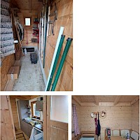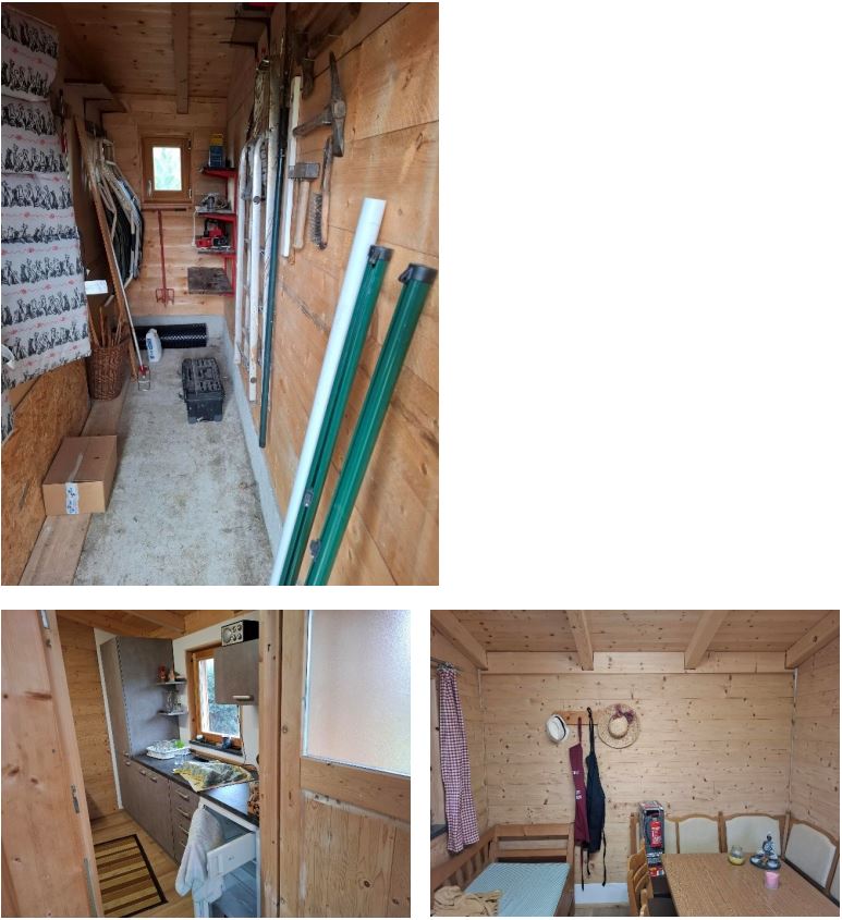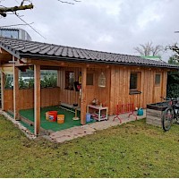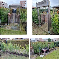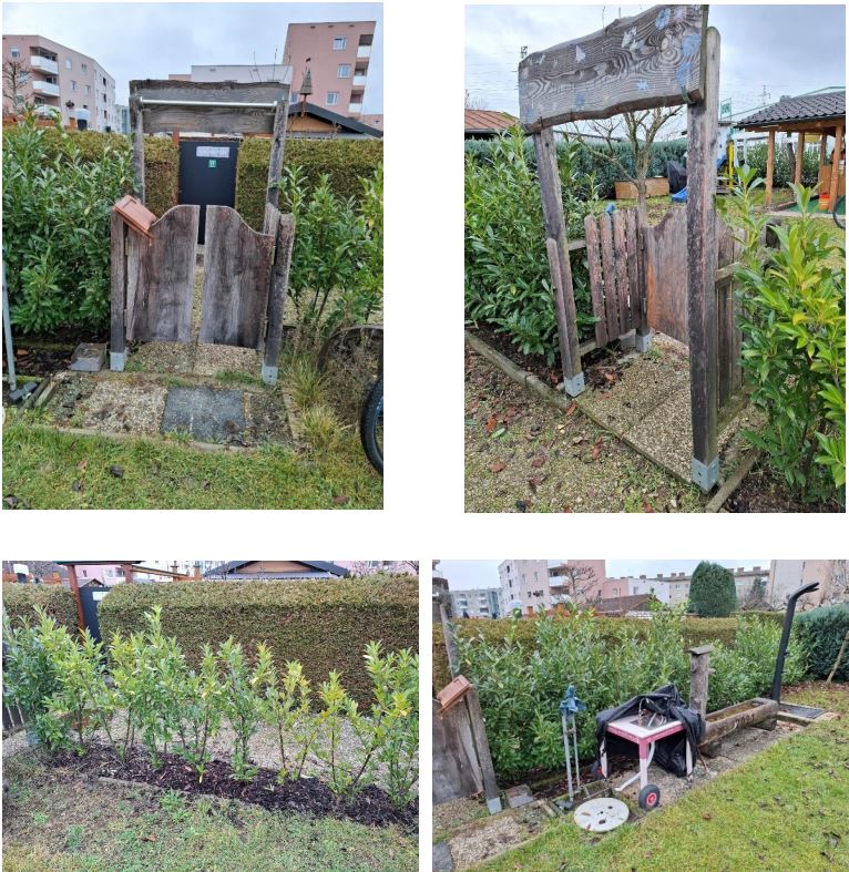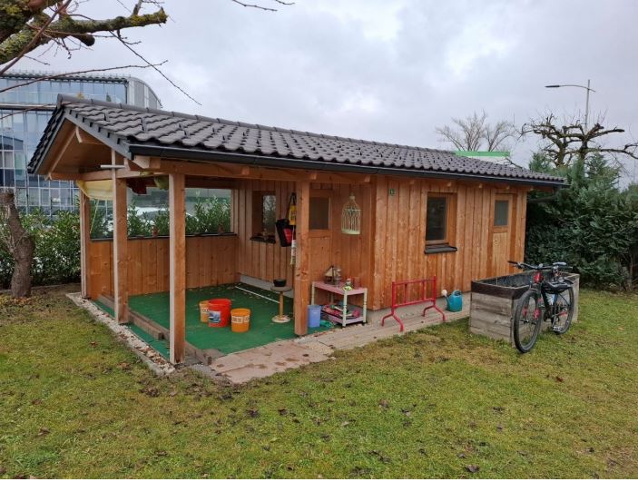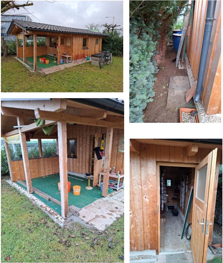 Terasse mit Schutzdach, Zierbrunnen und Hochbeet. WC-Anlage befindet sich in der Gartenanlage.