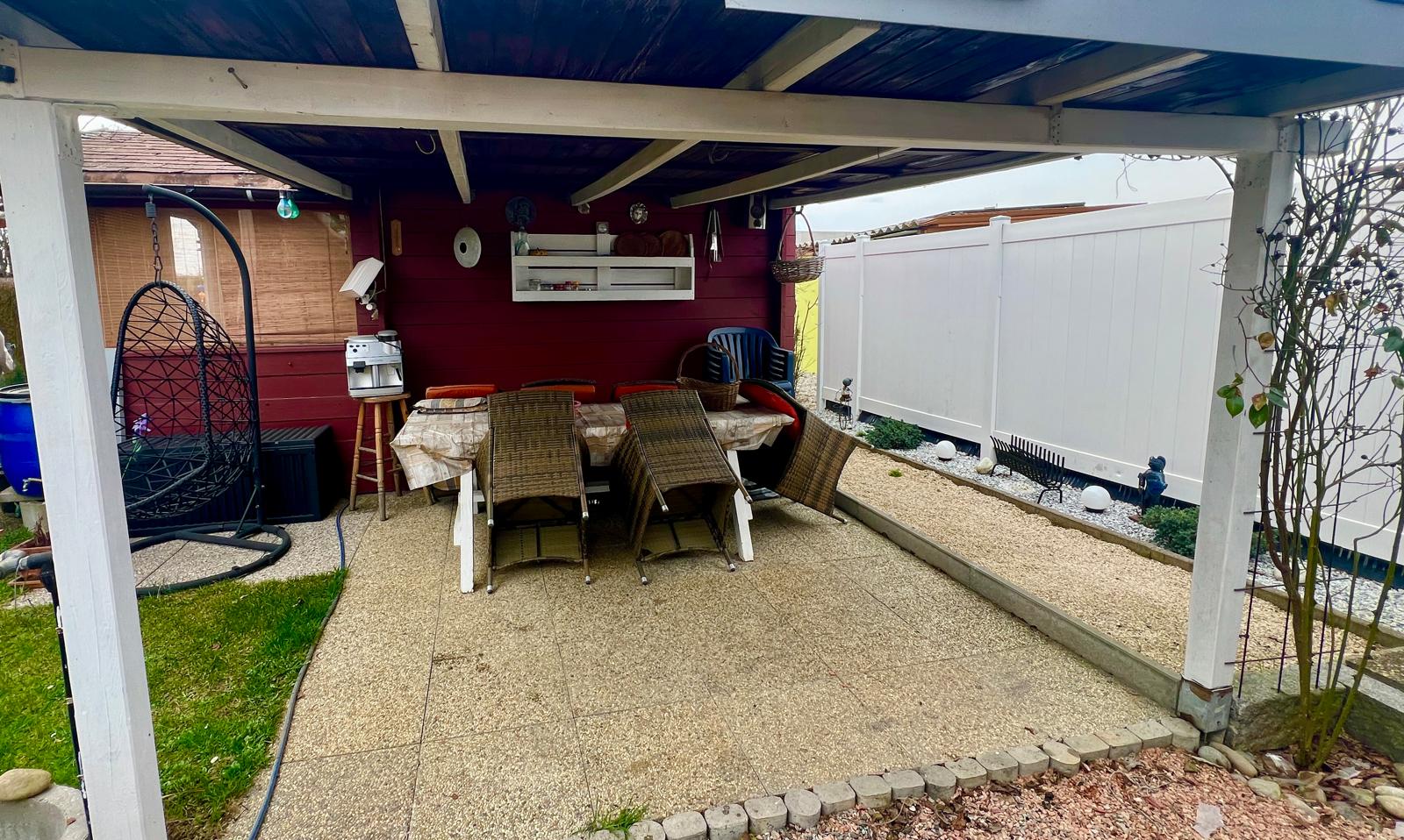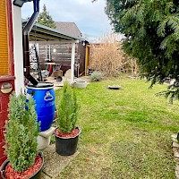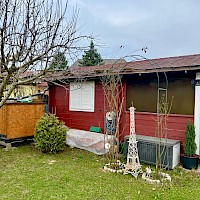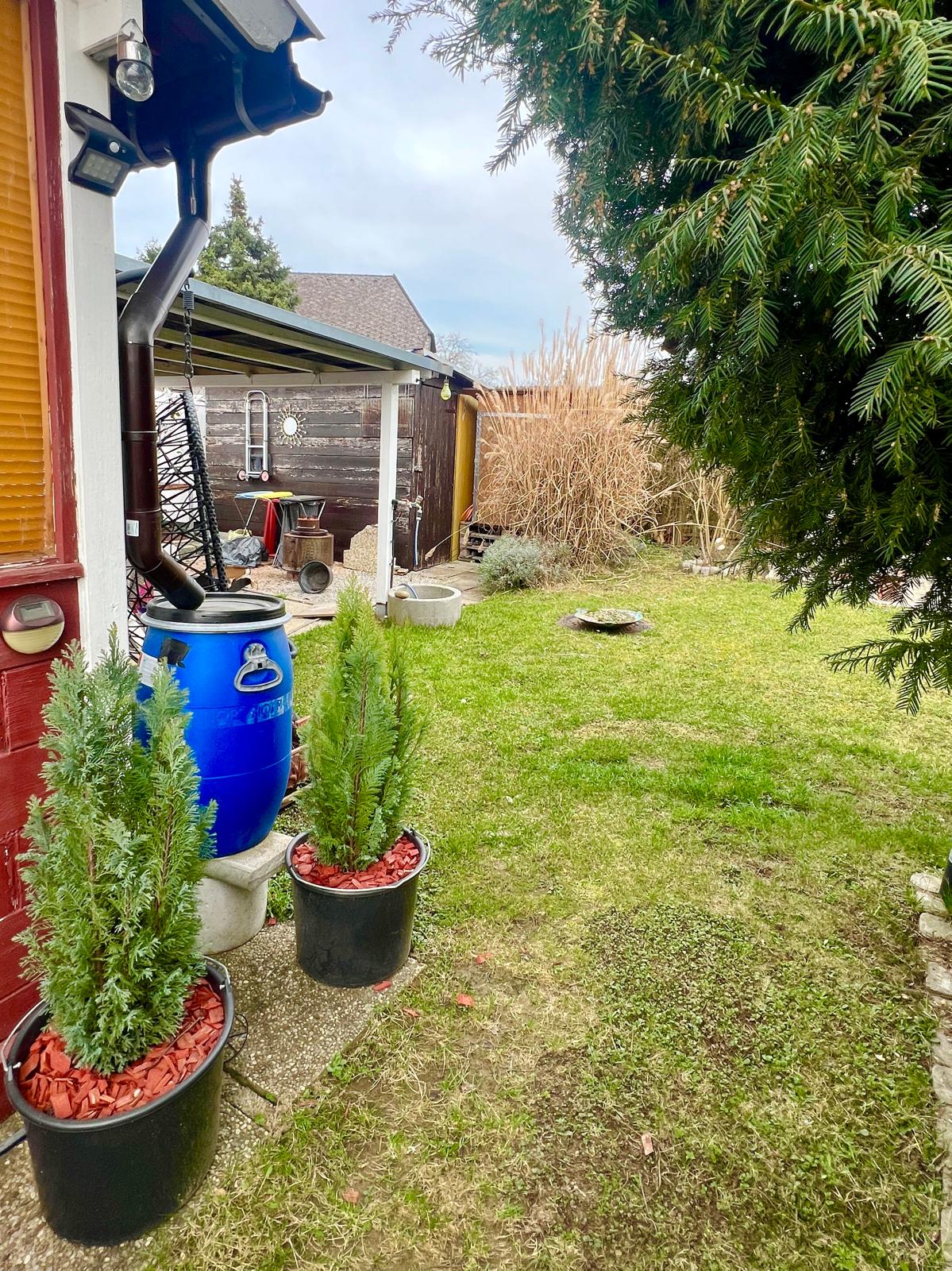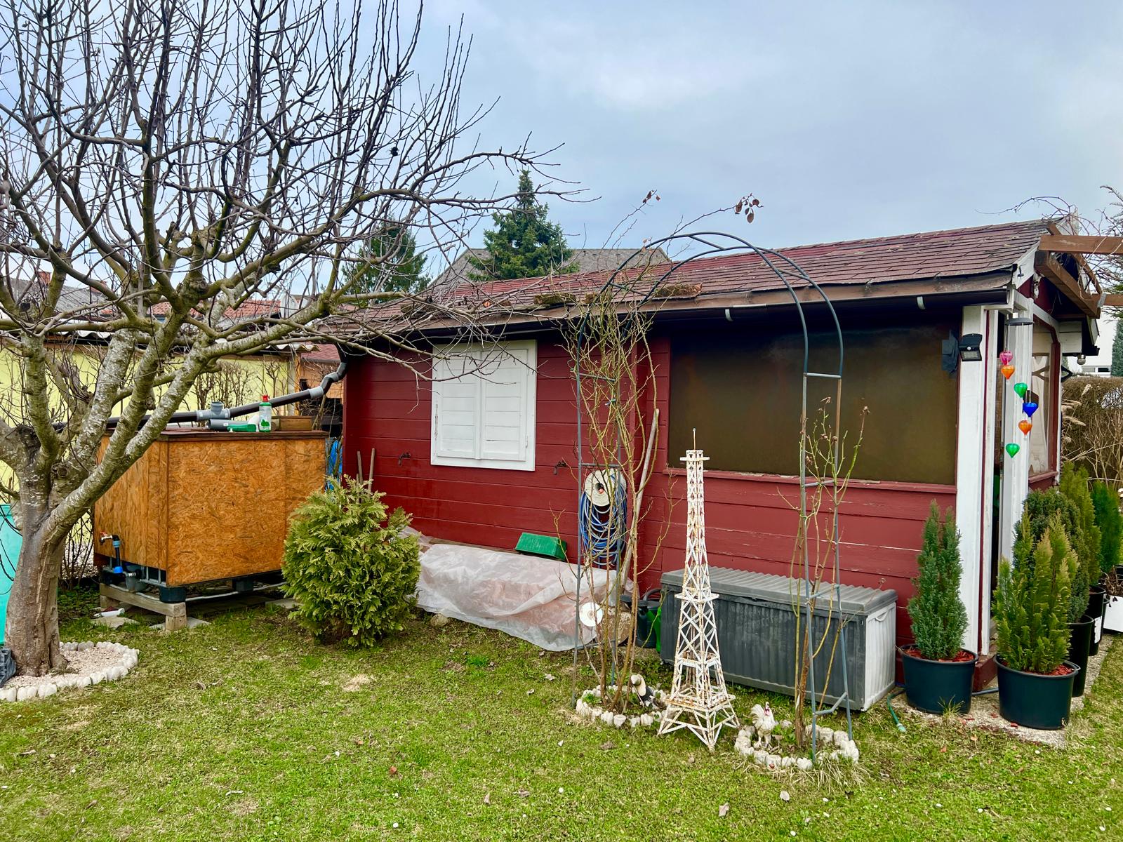 Garten mit Hütte und Holzschuppen