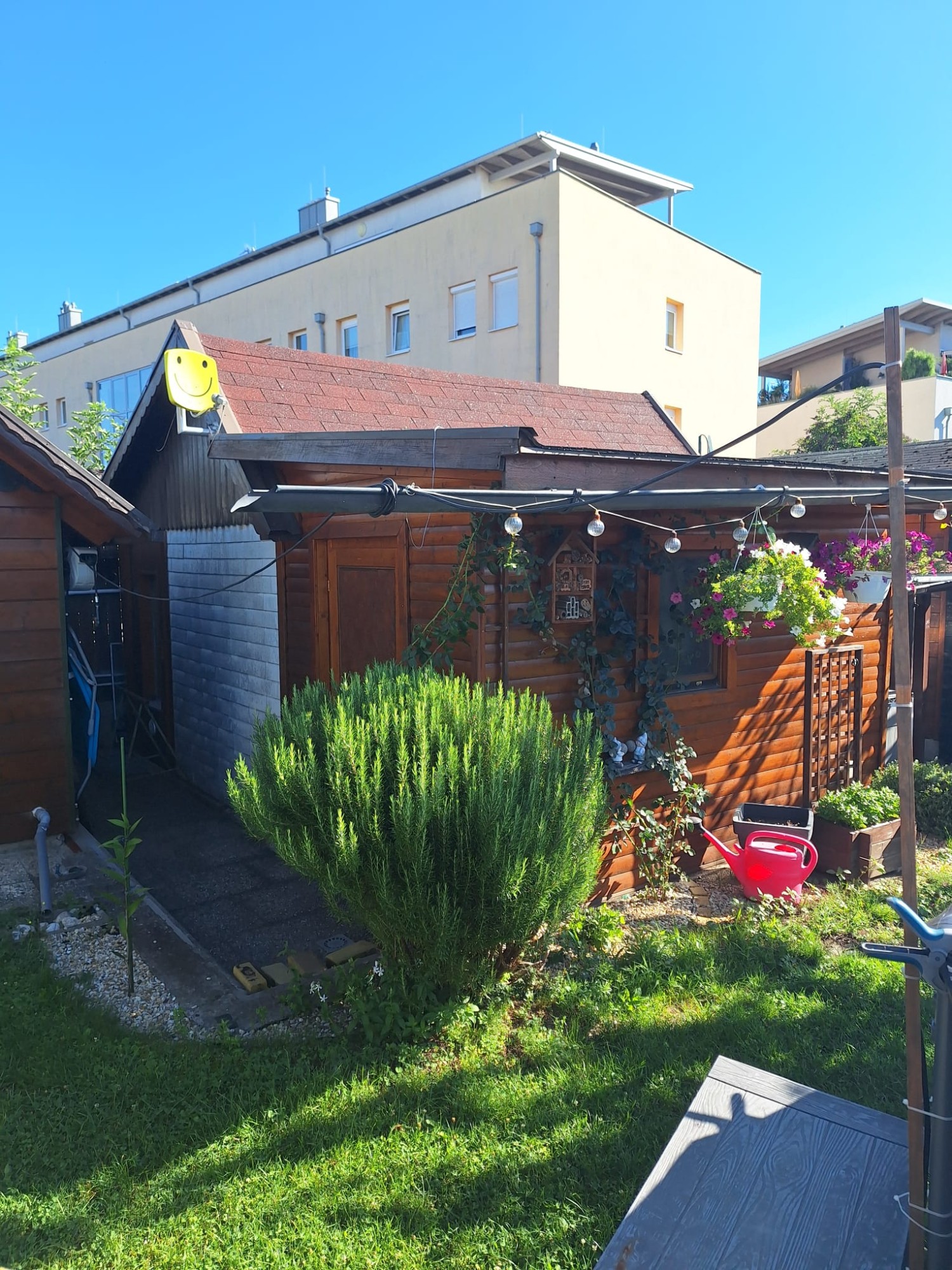 Ein schöner Garten mit Gartenhäuschen und Pool.