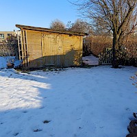Garten mit einer kleinen Hütte, kleine Werkzeughütte und einem Gemeinschaftswasseranschluss