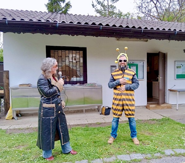 Waltraud Novak und Dominik Linhart von GLOBAL 2000 brachten allen Workshopteilnehmer:innen noch viele weitere Ratschläge für klimafittes Gärtnern näher: Mit viel Witz und Charme gab Dominik Linhart im Wildbienenkostüm den Stellvertreter einer wichtigen Gruppe, die im „Nationalpark Garten“ gefördert werden soll. Tipps zum Anlegen einer Blühwiese, Beispiele zur Integration wertvoller Lebensraumstrukturen im Garten und die Beantwortung vieler Fragen der Kleingärtner:innen rundeten den Workshop ab.