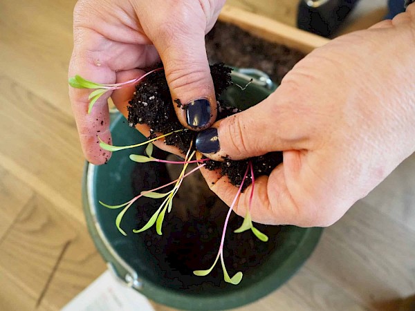 2. Jetzt kommen die Samen in die Erde: Große etwa einen Zentimeter in die Erde drücken, kleinere nur mit einer dünnen Schicht Erde bedecken.