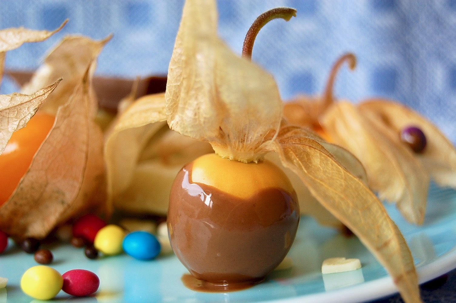 Die Kuvertüre im Wasserbad schmelzen und etwas geschmolzene Butter unterrühren. Die Blätter der Andenbeeren öffnen und Richtung Stiel nach oben biegen. Die Früchte dann in die Schokolade tunken. Wer möchte, kann die die mit Schokolade überzogenen Früchte noch mit Streuseln dekorieren.