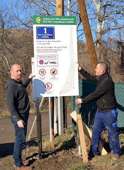 Die ersten wärmeren Tage dieses Jahres wurden im Zweigverein "Alte Leopoldauer Schleife" genutzt, um mit den geplanten umfangreichen Infrastruktur-Maßnahmen zu beginnen. Während die Arbeiten zu Wasserleitung und Kanal voraussichtlich im März starten werden, montierten Obmann Franz Tiebl und seine fleißigen Helfer (die Zweigvereinsmitglieder Schrenzer und Schmied) schon im Februar die neuen Orientierungstafeln. Insgesamt drei der neuen Wegweiser wurden an der Wagramer Straße und in der Nähe der Seyringer Straße aufgestellt. "Für Besucher, aber insbesondere für Einsatzkräfte, bieten die neuen Schilder eine super Orientierung", zeigt sich Franz Tiebl über das Ergebnis sehr zufrieden.