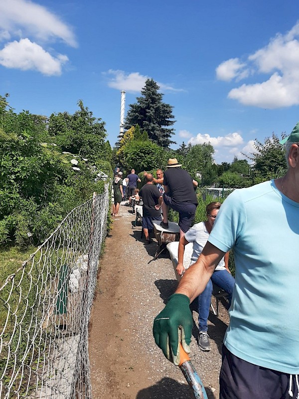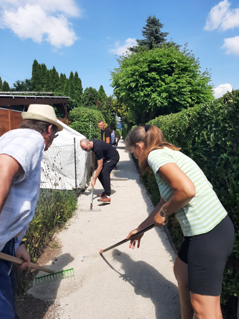 Und am 16. 6. 2023 ging's los. Es wurde geschaufelt und gerecht, was das Zeug hielt. Ausgerechnet am ersten heißen Tag des Jahres. Aber besser als Regen! Es waren so viele Helfer da, dass es einen Stau wie am Montagmorgen auf der Süd-Ost-Tangente gab. Alle waren da, sogar unsere Jüngsten arbeiteten eifrig mit. Jene Mitglieder, die keine Zeit hatten, spendeten kühle Getränke, über die sich alle freuten.