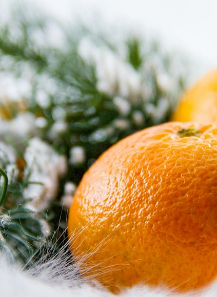 Die Orangenschalen und Apfelscheiben vollständig trocknen lassen – entweder an der Luft oder bei ca. 60 Grad im Backrohr. Die Fichtennadeln von kleinen Zweigen abstreifen.