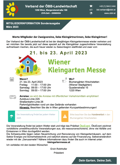 Auch dieses Jahr ist der Verband der ÖBB-Landwirtschaft wieder auf der Wiener Kleingarten Messe vertreten. Daher möchten wir Sie bereits jetzt auf diese Veranstaltung aufmerksam machen, die speziell auf Kleingärtnerinnen und Kleingärtner zugeschnitten ist.