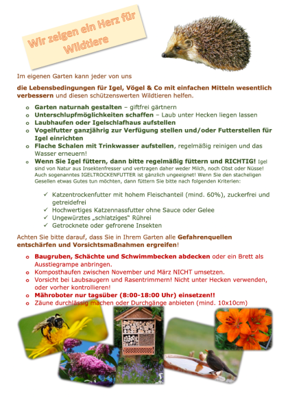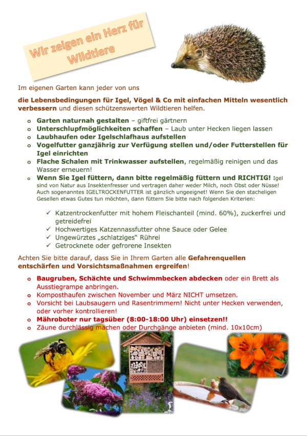 Ein großes Herz für Wildtiere zeigt der Zweigverein Strasshof: Obm. Stv. Karin Hauser-Fleischhacker zeigt mit einem informativen Aushang, wie man im eigenen Garten die Lebensbedingungen für Igel, Vögel und Co. wesentlich verbessern und den schützenswerten Wildtieren helfen kann. Die Tipps können Sie auch als PDF in unserem Downloadbereich herunterladen.