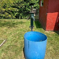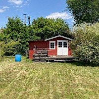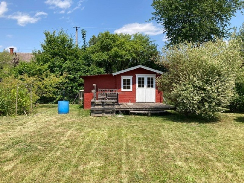 Gartenhäuschen mit Terrasse, Geräteschuppen mit Rasenmäher, Griller und Gartenwerkzeug.