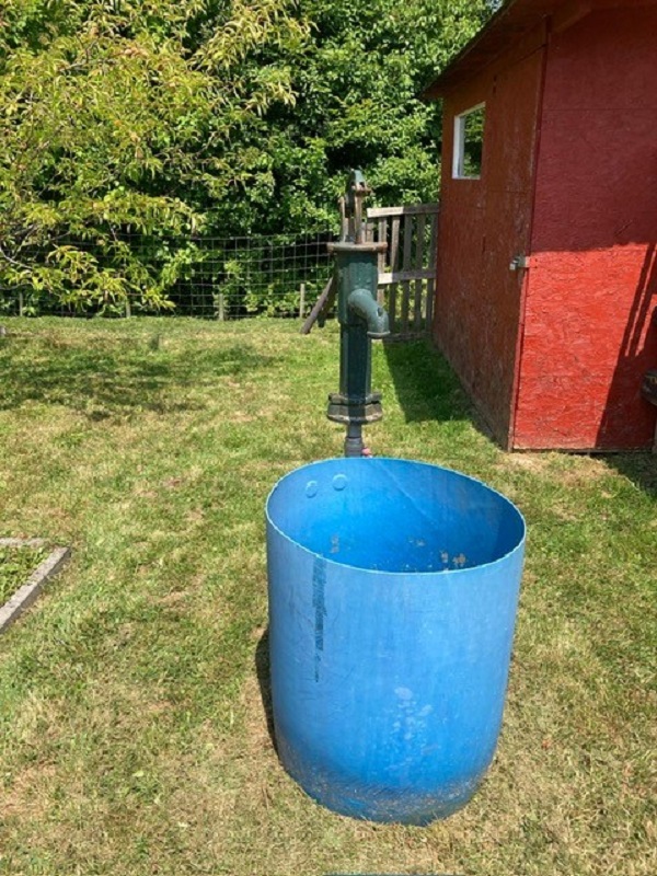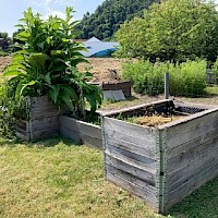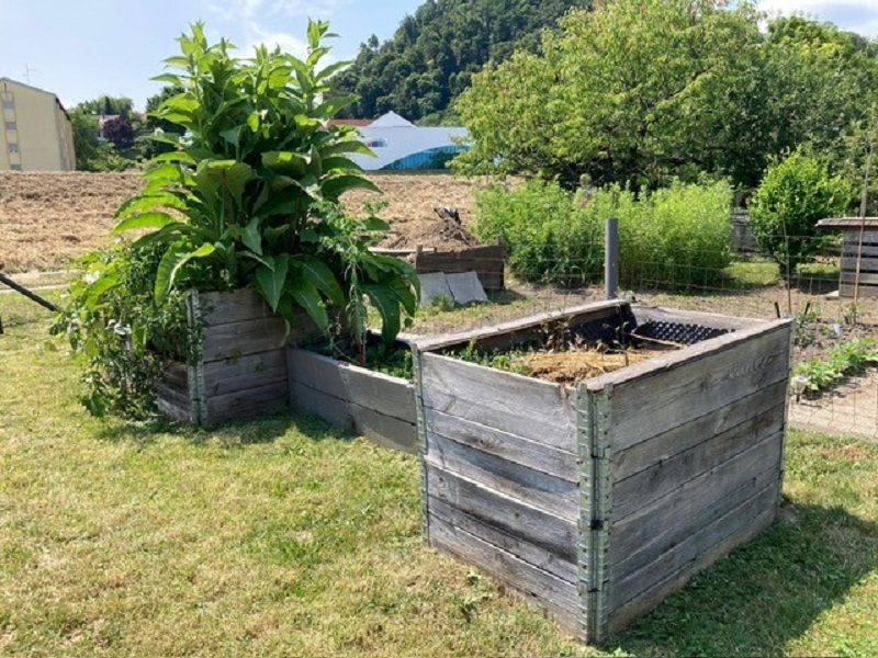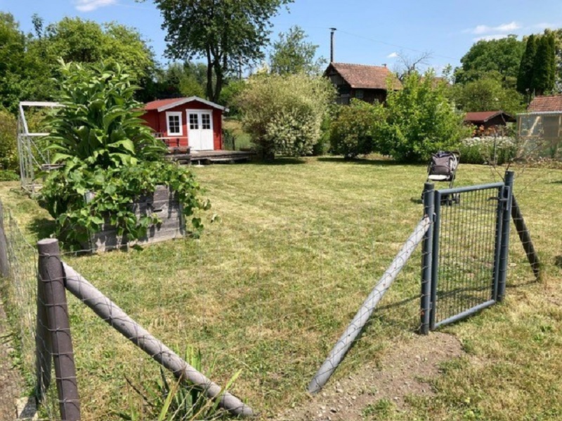 Schöner Garten mit 4 Hochbeeten und ein kleines Gartenbeet, Obstbäume.