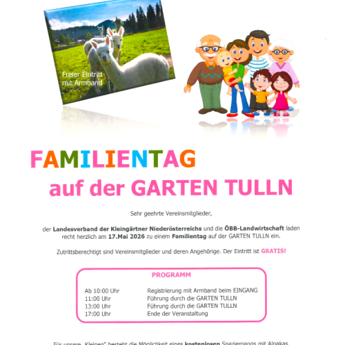 Der Landesverband der Kleingärtner Niederösterreichs und die ÖBB-Landwirtschaft laden alle Vereinsmitglieder und deren Angehörige herzlich am 17. Mai 2026 zum Familientag auf der GARTEN TULLN ein.