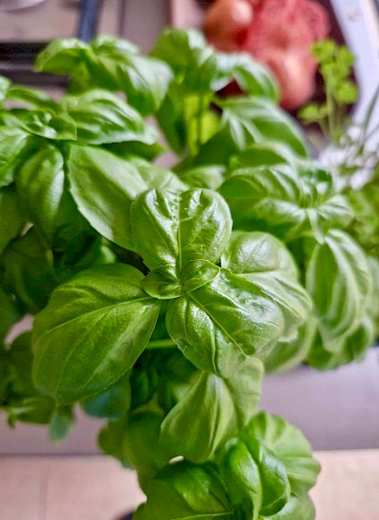 Bei uns weithin als Basilikum bekannt, trägt die beliebte Gewürzpflanze zahlreiche Namen: Egal, ob Basilie, Basilienkraut oder Königskraut genannt, gerade im Sommer darf der Aroma-Star unter den Kräutern in Garten und Küche nicht fehlen. Es gibt viele verschiedene Basilikum-Sorten. Eine, die besonders gut gedeiht, ist das Basilikum Genovese. Es besticht durch seine glänzend-dunkelgrüne Farbe, große, gewellte Blätter und seinen intensiv würzigen Geschmack.