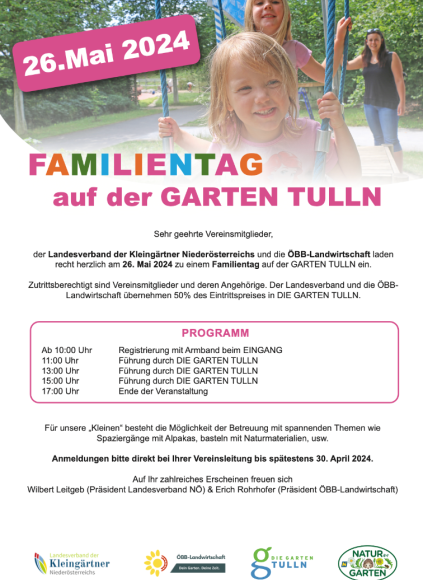 Der Landesverband der Kleingärtner Niederösterreichs und die ÖBB-Landwirtschaft laden alle Vereinsmitglieder und deren Angehörige herzlich zum Familientag auf der GARTEN TULLN ein!