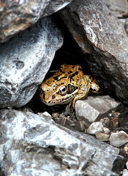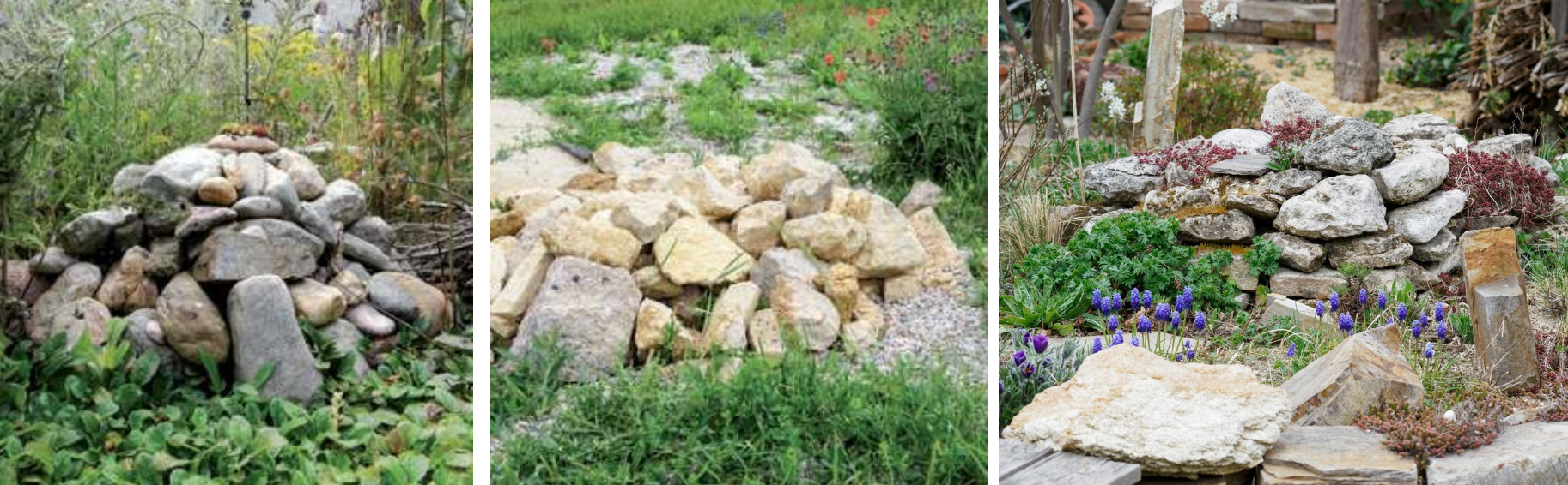 Ein Steinhaufen dient als Versteck und Unterschlupf für Eidechsen, Kröten, Käfer und viele andere Tiere. Der "Steinkeller" darunter bietet den Tieren ein Winterquartier.