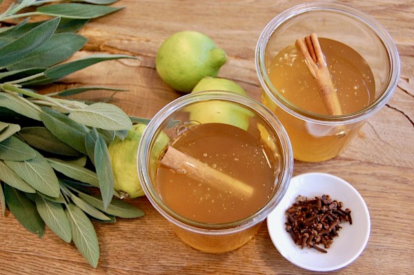 Ein wohltuendes Rezept für die Erkältungzeit: 15 frische Salbeiblätter, Saft und Schale einer Zitrone, eine Zimtstange und ein paar Gewürznelken in ein halbes Kilo Honig rühren und vier Wochen ziehen lassen. Ein Löffel des Salbeihonigs (pur oder im Tee) schmeckt winterlich-würzig - und sorgt bei Halsschmerzen für Linderung.