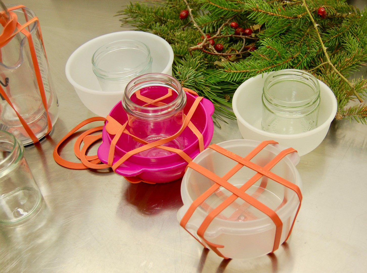 1. Je zwei Gummiringerl längs und quer um die runde Schüssel spannen. So entsteht ein Viereck, in das mittig das Glas gesetzt wird. Das Glas sollte ein paar Zentimeter Abstand zum Boden und zum Rand der Schüssel haben. Ist es zu schwer, gibt ein weiteres Gummiringerl zusätzlichen Halt.