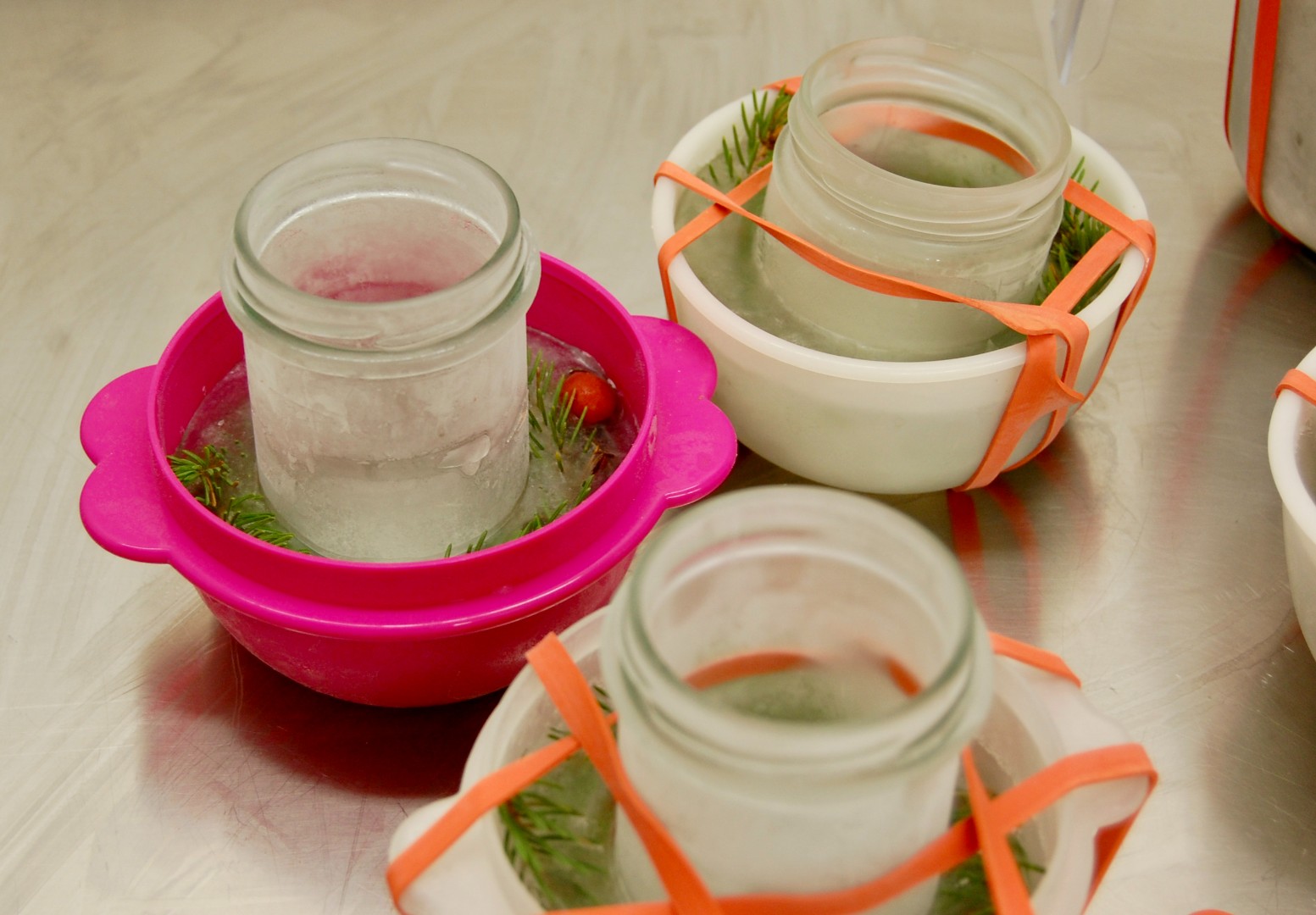 3. Über Nacht im Freien stehen lassen oder ins Gefrierfach legen. Sobald das Wasser vollständig gefroren ist, können die Eislichter aus der Form gelöst werden. Ganz leicht geht das, indem man warmes Wasser in das Glas gießt.