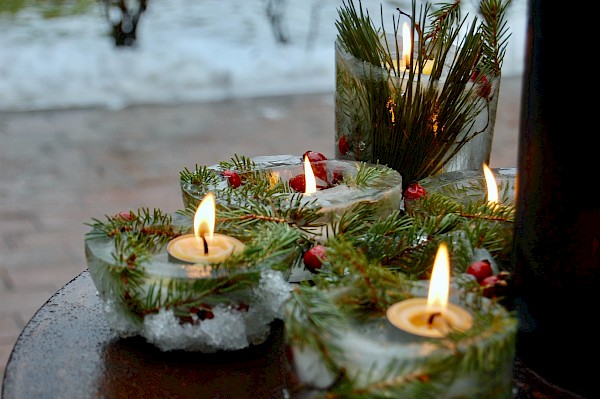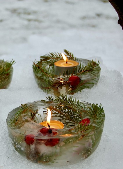 4. Zum Schluss ein Teelicht oder eine kleine Kerze in die Vertiefung der Eisform legen und das Lichtlein draußen an einen kühlen Ort stellen. Fertig!